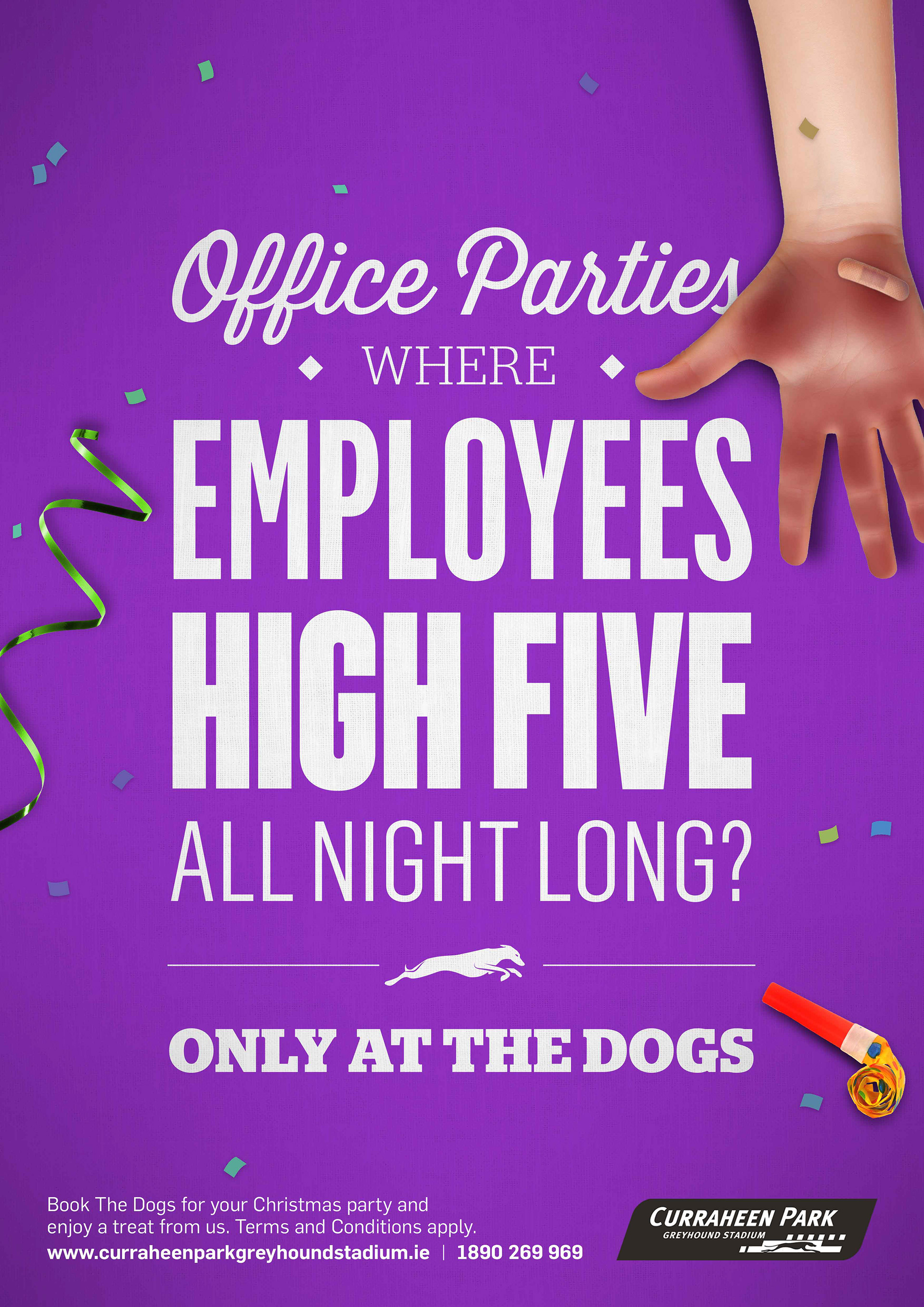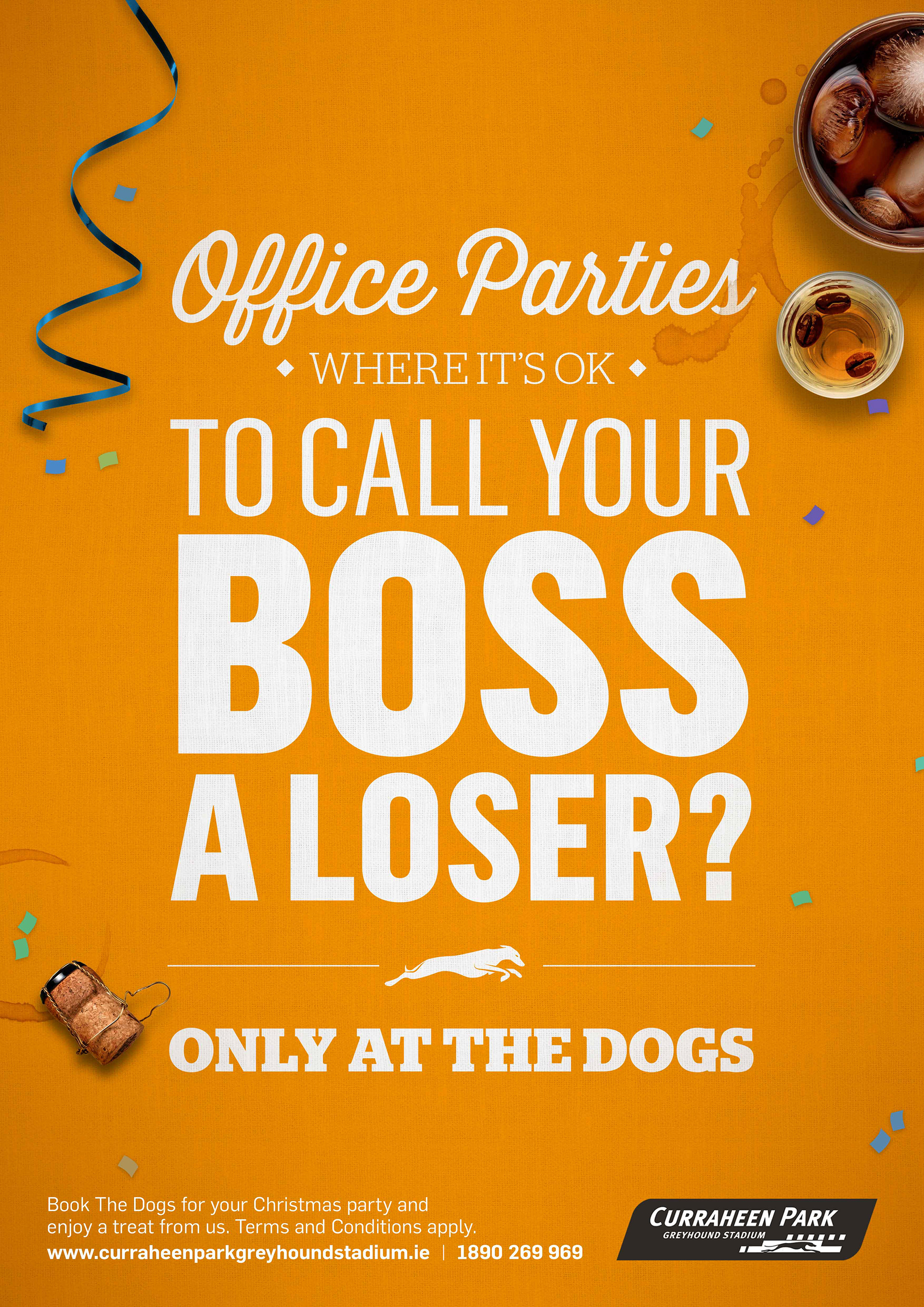 We made a suite of these posters for the greyhound racing stadiums all around Ireland to catch the Christmas Office Party bookings; and to show off the cheeky craic and messing you can have only at the Dogs.