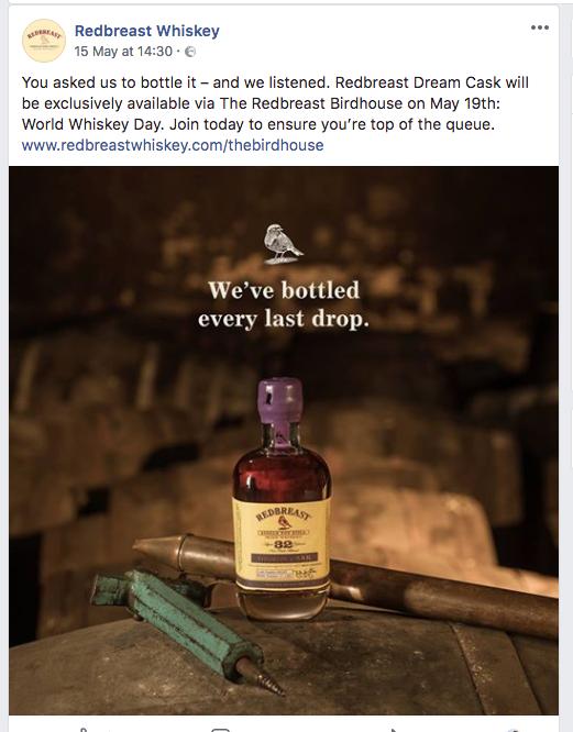I worked with ZooDigital handling the Redbreast and Spot Whiskey social media and email marketing for a number of years. This included the Redbreast Birdhouse, the exclusive online club for Redbreast lovers. As a result, we got to launch the first ever Dream Cask. It sold out in six hours, making it one of the world's fastest-ever selling whiskeys.